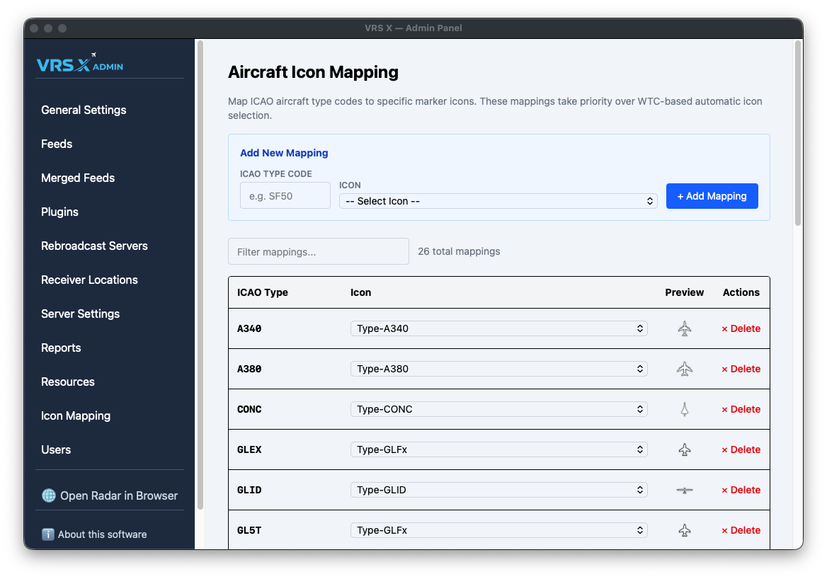 While VRS X features an intelligent automatic icon selection based on Weight Turbulence Category (WTC), you can manually override these defaults for specific aircraft. This allows you to assign dedicated silhouettes to your favorite or most common aircraft types.