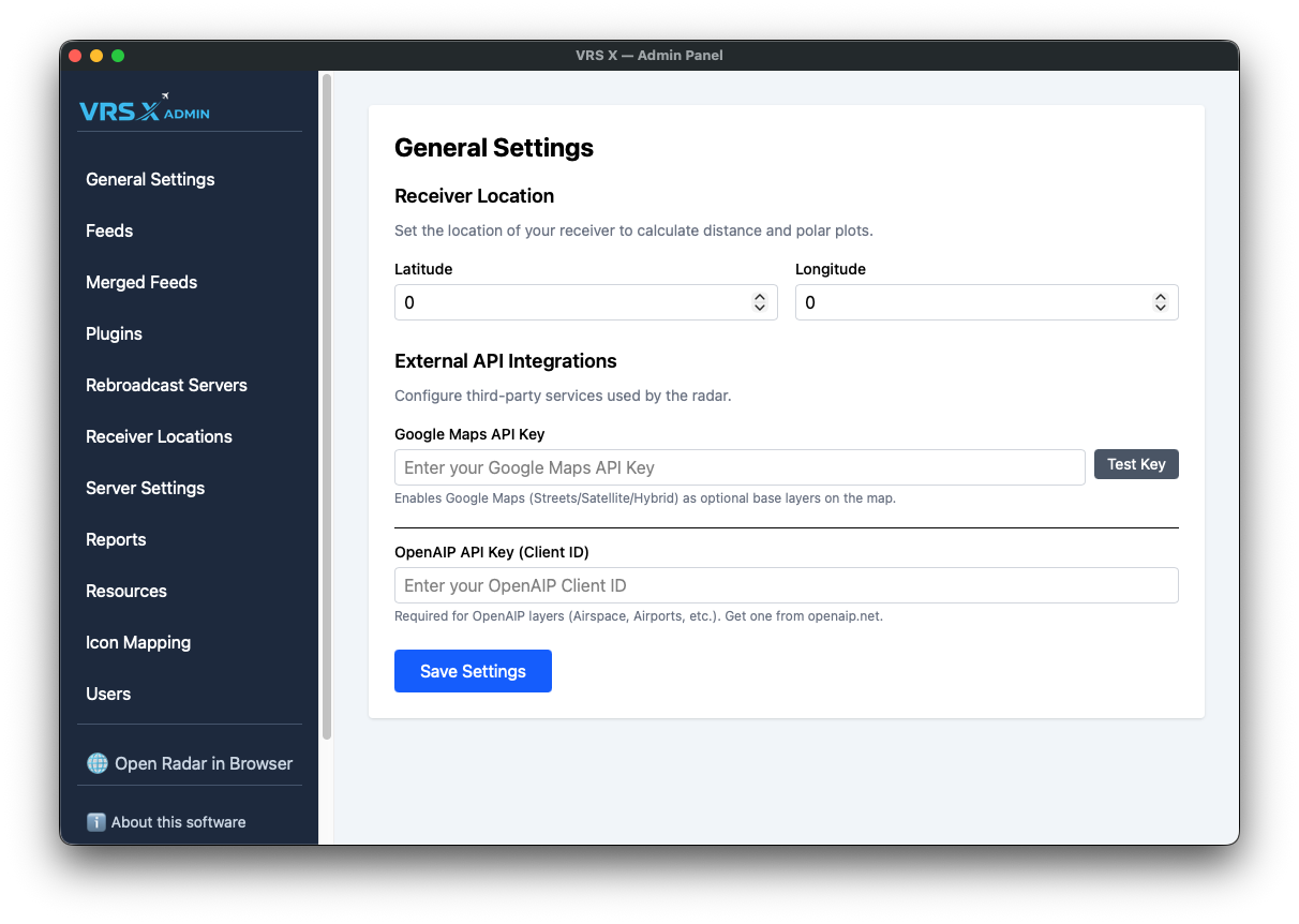To enhance your radar experience with professional-grade base layers and aeronautical data, VRS X supports integration with third-party providers. These configurations are located in the General Settings panel.